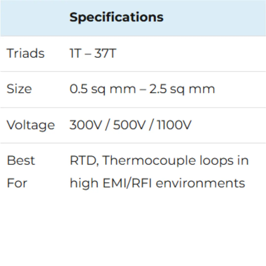 Three conductors are precision-twisted together with a single, overall aluminium-mylar screen. This is the highly cost-effective standard for 3-wire RTD circuits and thermocouple compensation where general EMI protection is needed, but individual triad isolation is not mandatory.